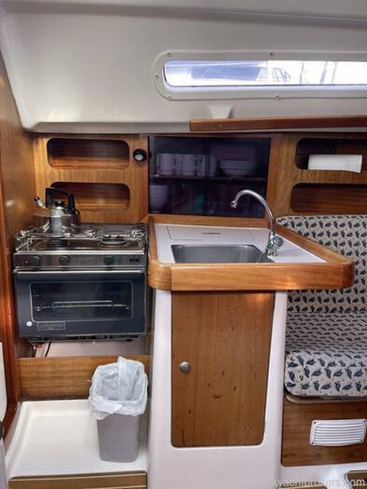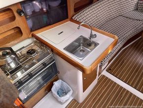 SALOON Two settee berths, saloon table with folding leaves, storage lockers, storage under the settees and opening deck hatch. GALLEY L-shaped is to port and comes with a two burner gas cooker and oven, stainless steel sink with cold pressurised water, 12V. fridge and storage lockers.