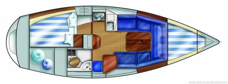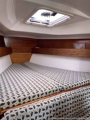 FORWARD (open plan), double berth with opening deck hatch, shelving and storage under the berth