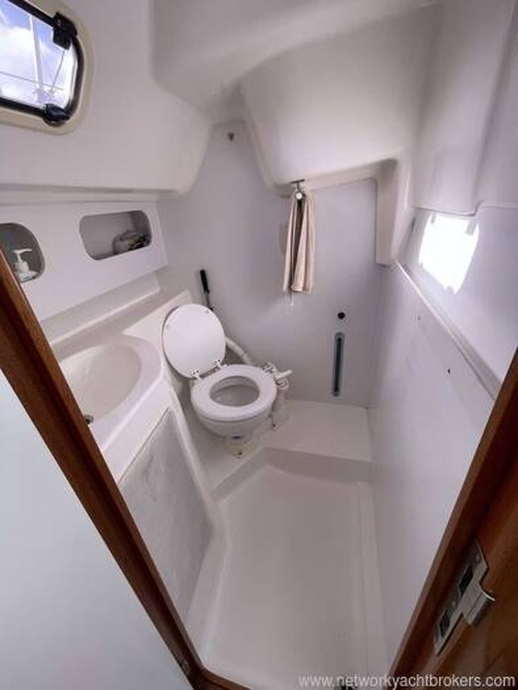 HEADS COMPARTMENT to starboard with a marine toilet, wash-hand basin and opening porthole