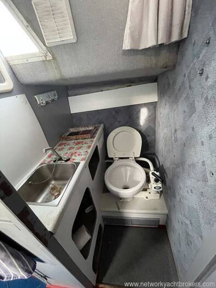 Heads in a separate compartment aft of the galley to starboard with a marine toilet and stainless steel sink with hot water via the engine.