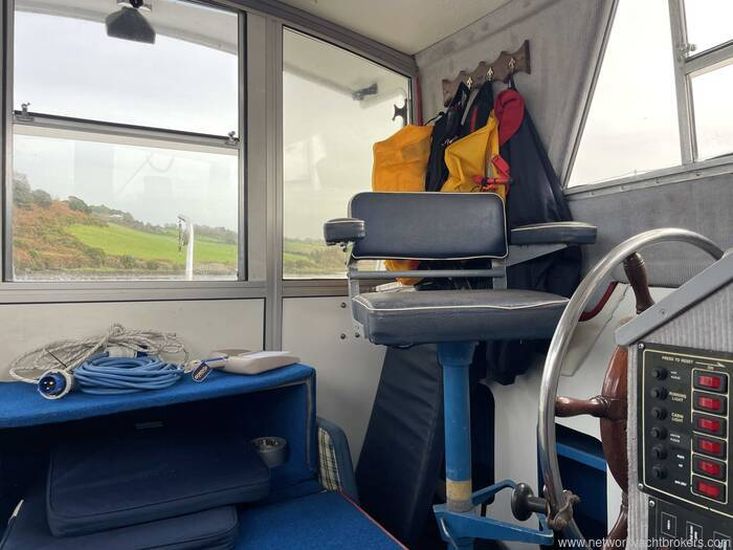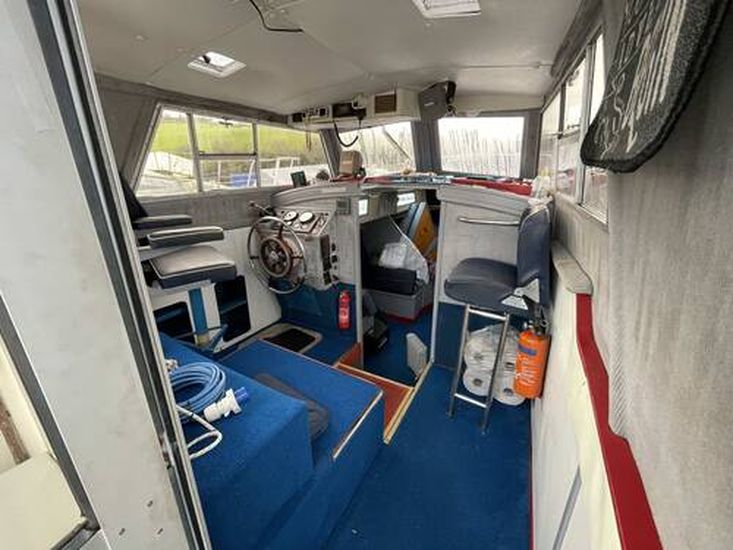 Roomy fully enclosed wheelhouse with opening side windows, helm seat to port and co-pilot seat to starboard.