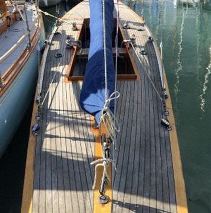 Built to the International 6m rule in 1932. She has a pine carvel hull on mahogany frames with teak decks. Copper fastened with clenched frames. Her topsides require re-finishing but the planking is in sound condition. She has a long keel with lead ballast. Tiller steering to a keel-hung rudder. Last surveyed in 2018. She has been in her current ownership for 10 years.
